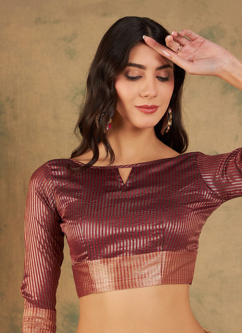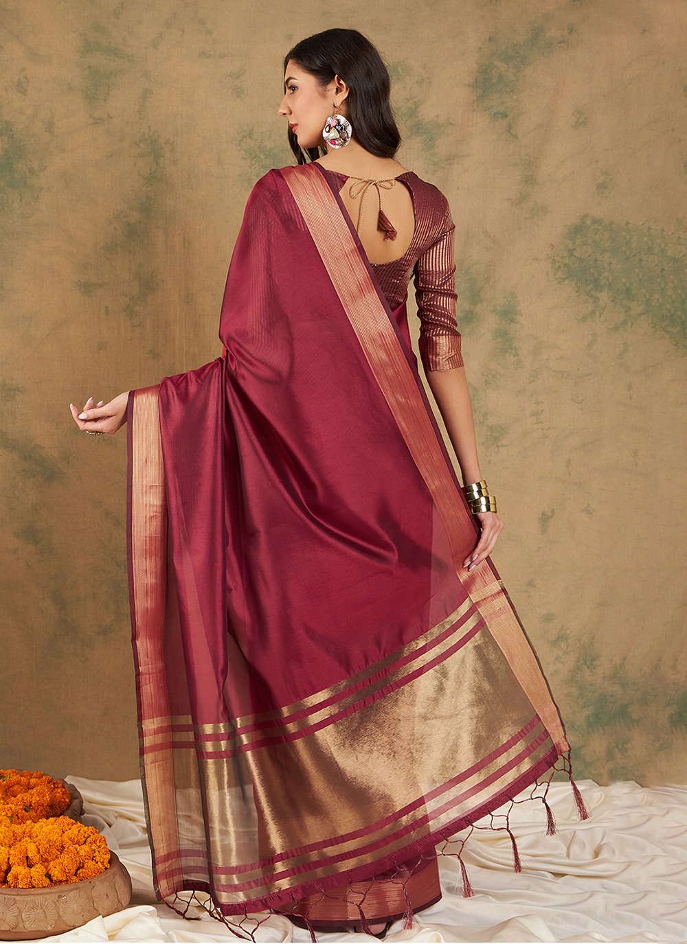 Add the sense of feminine beauty by this maroon cotton and organza contemporary sari. This attire is nicely designed with . Comes with matching blouse.