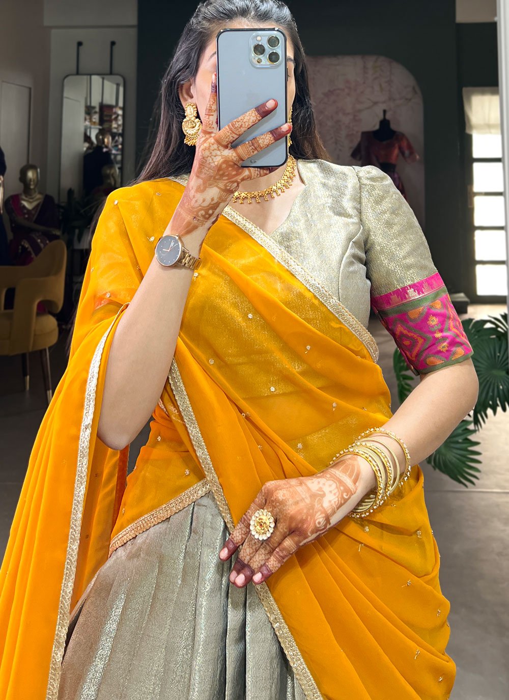 Give in to the exotic confluence of today and tomorrow in this beautiful attire. Steal the hearts away with this silver jacquard silk a - line lehenga choli. The lovely a substantial feature of this attire. Comes with matching choli and dupatta.
