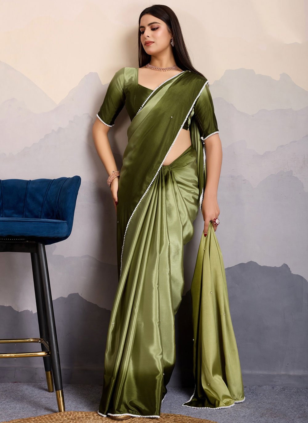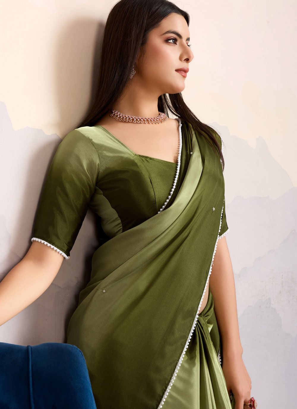 Green Pure Crepe Contemporary Saree with Moti Work for Casual