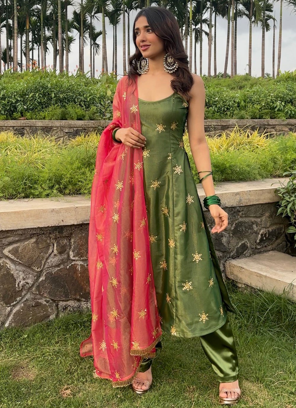 Elegance and honourable come together in this beautiful drape. Real beauty comes out from your dressing style with this green silk blend readymade salwar suit. This lovely attire is looking extra beautiful with embelishment of . Comes with matching dupatta.