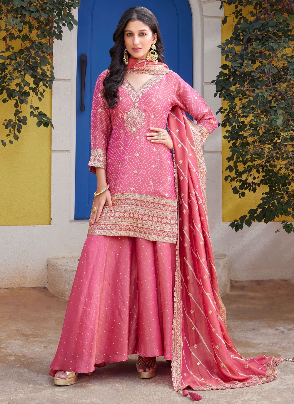Magnificent Pink Silk Readymade Salwar Suit with Embroidered, Print, Sequins and Zari Work