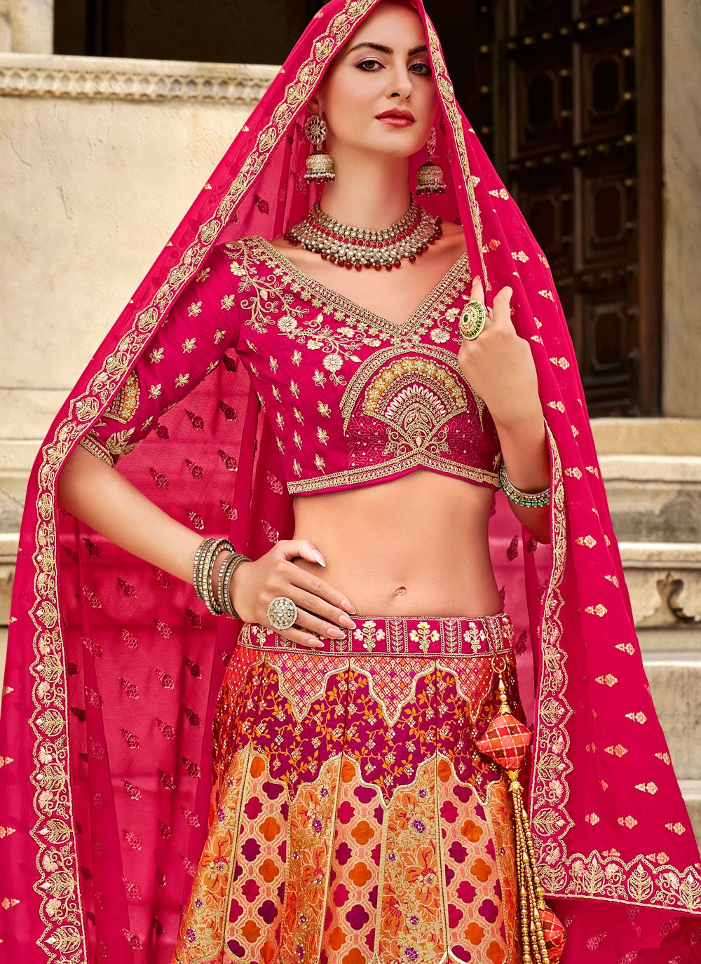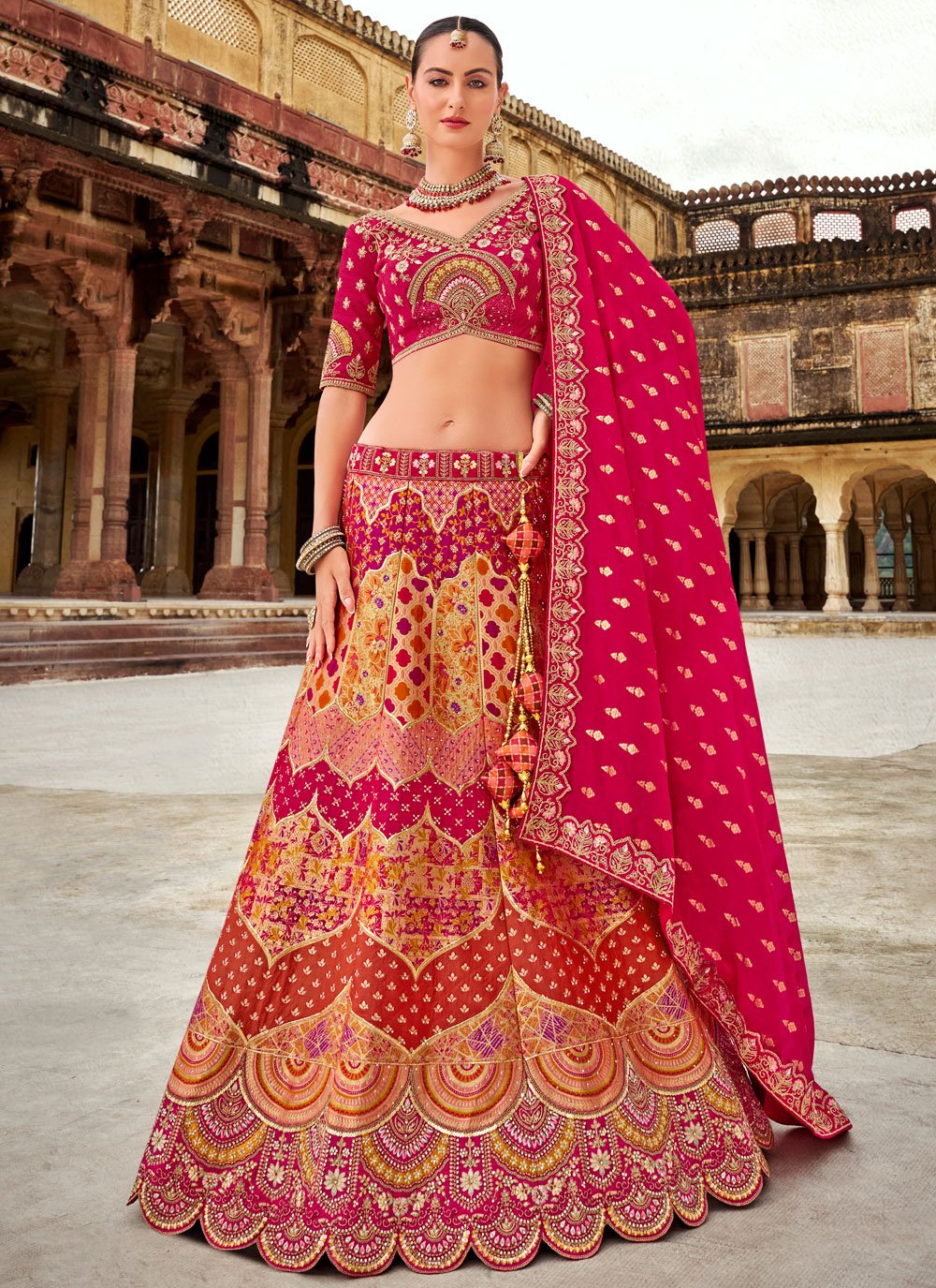 Grab the second look in this elegant attire for this season. Be the center of attraction with this multi colour banarasi silk lehenga choli. Look ravishing clad in this attire which is enhanced . Comes with matching choli and dupatta.