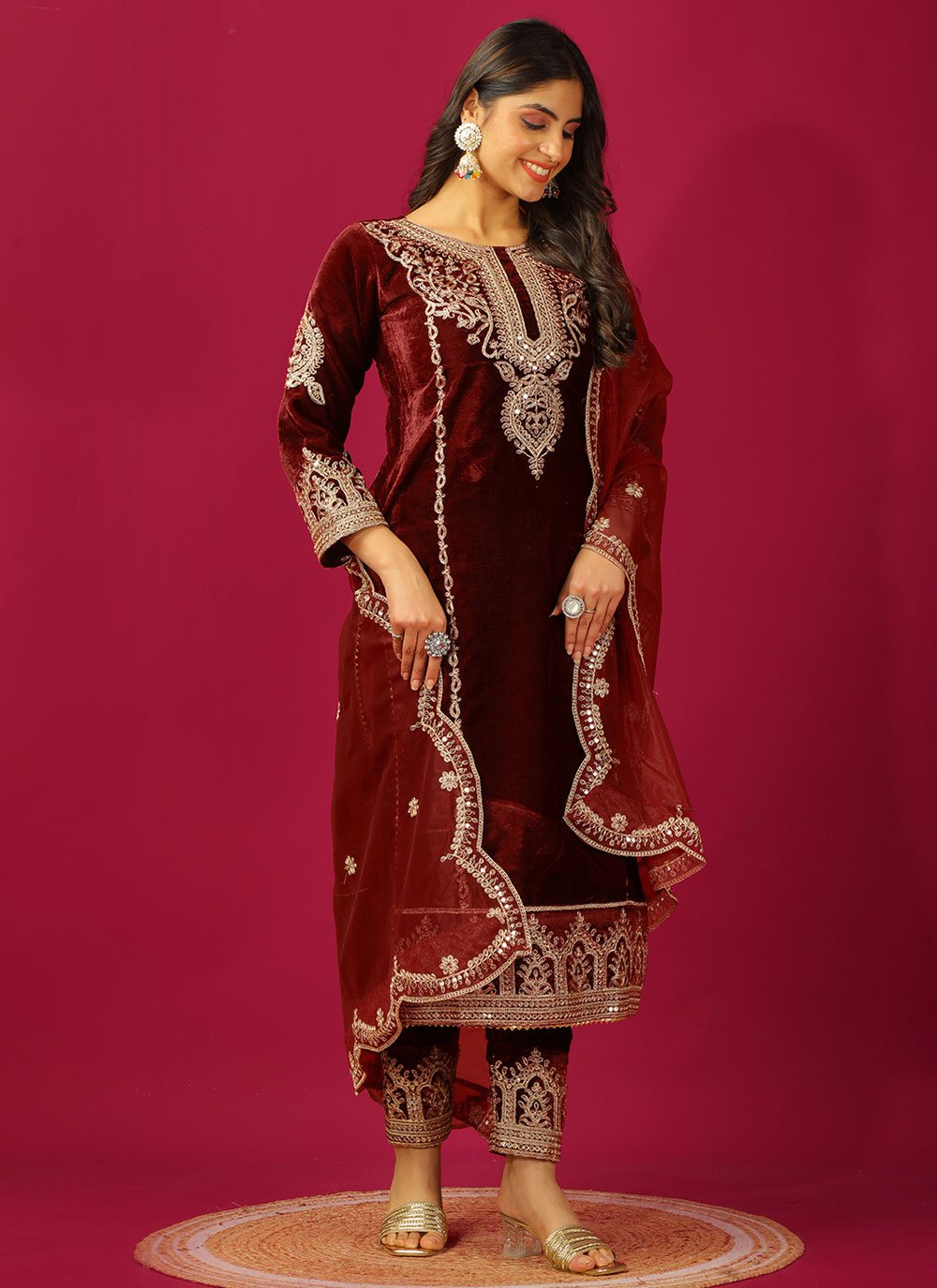 Add grace and charm to your appearance in this maroon velvet and viscose readymade salwar suit. Look ravishing clad in this attire which is enhanced . Comes with matching dupatta.